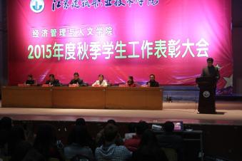 2015年11月11日晚,经济管理与人文公司在会堂隆重召开了2015年度秋季员工工作表彰大会,经管公司巩海霞经理、白海云书记、方升副书记、分团委书记朱敏老师、工商管理系主任王彦、曹前老师及全体专职辅导员出席了本次大会。