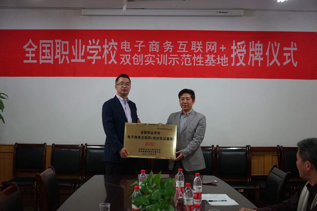 2016年10月11日下午,中国职业教育学会装备专业委员会双创实训基地总监刘永家、京东全国客服中心校企合作经理蒋继禹一行莅临经济管理与人文公司,授予公司“全国职业公司电子商务互联网+双创实训示范性基地”称号。