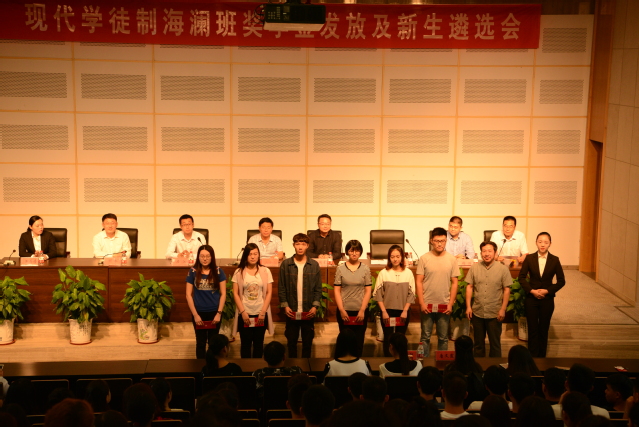 会议表彰了在上一学年取得优异成绩的海澜班同学并发放奖学金,会后海澜集团对2017级新生进行组班遴选。