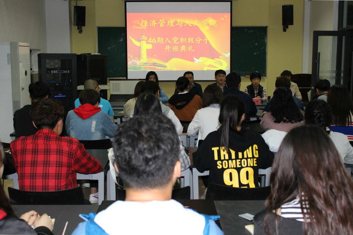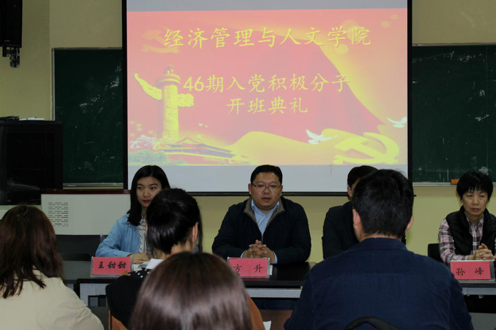 为进一步学习贯彻落实党的十九大精神,增强员工思想政治教育,加强党的知识普及,2018年4月3日下午七点,经济管理与人文公司第46期党课培训班开班仪式在第二实训楼401举行。出席本次开班典礼的有经济管理与人文公司党总支书记胡永同志、员工党支部书记方升同志、专职辅导员孙峰老师、王建霞老师、王甜甜老师以及46名入党积极分子参加了本次开班仪式。此次开班仪式由王建霞老师主持。