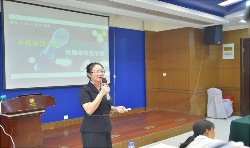 本次培训分为酒店理论培训和酒店岗位实训培训,酒店专业刘胜勇主任和夏远利副教授,分别对《宾客消费心理需要与应对》和《酒店服务礼仪》做了培训。国信云台宾馆总经理韩飞燕亲自讲授《酒店运行管理体系框架》课程,房务总监庄秦、营销总监朱杰分别讲授了《客房服务及突发事件应急处理》、《酒店营销原理》等课程。
