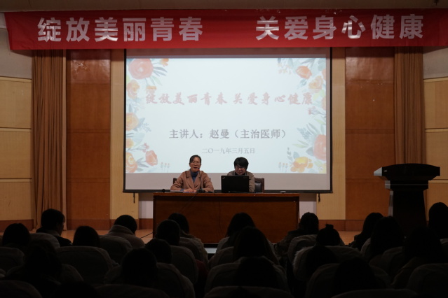 3月5日晚七点,经管公司特邀校医院主治医师赵曼在第一实训楼报告厅开展了以“绽放美丽青春,关爱身心健康”为主题的知识讲座。公司党总支副书记李国琴、公司部分女教职工,经管公司全体在校女生(女职工)及兄弟公司部分女生,近六百人参加了此次讲座。