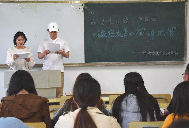 为贯彻落实社会主义核心价值观,培养同学们的诚信意识,提高自身道德修养,展现当代老员工的精神风貌,4月19日晚,经管公司分团委在教三楼C座108室举办我为社会主义核心价值观代言 “诚信友善”演讲比赛,本次比赛由酒店18-2江汶哲和酒店18-1贺雪丹担任主持。