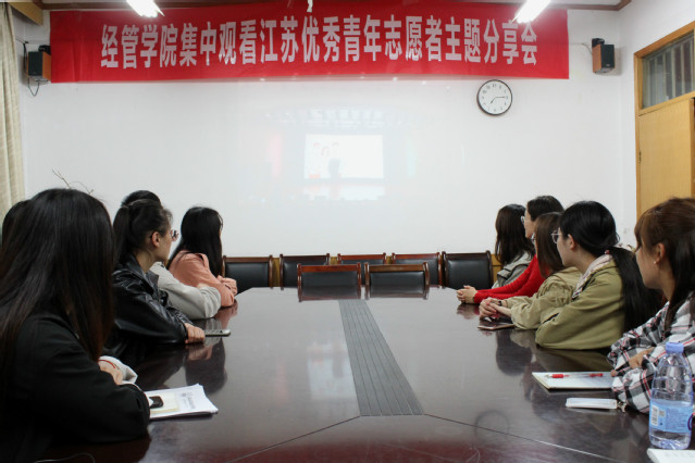 为引领广大青年志愿者深入学习贯彻习近平新时代中国特色社会主义思想和党的十九大精神,进一步领会习近平总书记关于志愿服务的重要指示精神,提高志愿者的志愿服务意识,4月25日晚经济管理公司组织广大志愿者集中观看“江苏优秀青年志愿者主题分享会”的网络直播。辅导员王建霞老师、经管公司青年志愿者协会40多名志愿者共同观看。