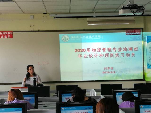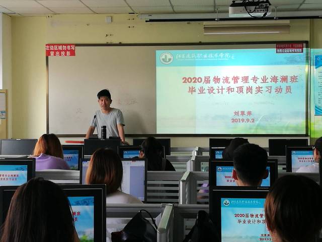日前,物流17-2(海澜班)在进入海澜集团顶岗实习前进行了毕业设计和顶岗实习动员,由物流教研室主任刘翠萍主讲,主要包括:设计要求和进度安排,实习的意义,实习内容,特别强调进入企业后注意安全,认真和师傅学习等。教学经理王传彬亲自到场进行安全教育,希望大家珍惜实习机会,努力工作,为公司增光添彩!(物流管理教研室供稿)