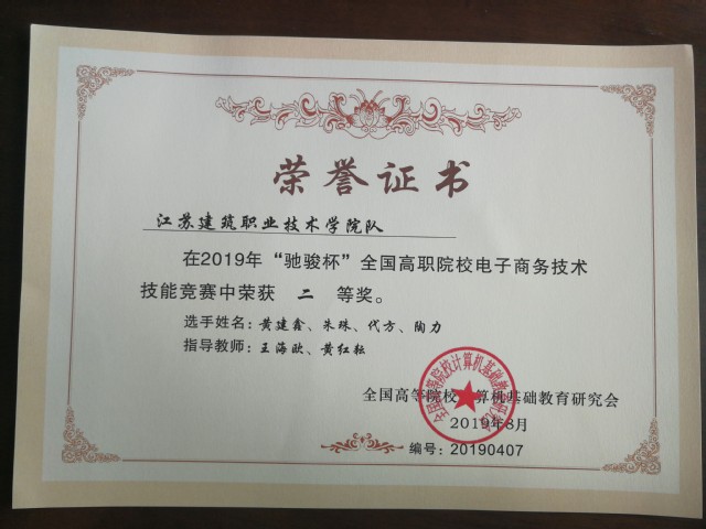 2019-8-13日,2019全国高职院校“驰骏杯”电子商务技术技能竞赛在江苏南京举办,公司电子商务专业朱珠等四位同学,在比赛中发挥正常,成绩优异,获得竞赛二等奖。