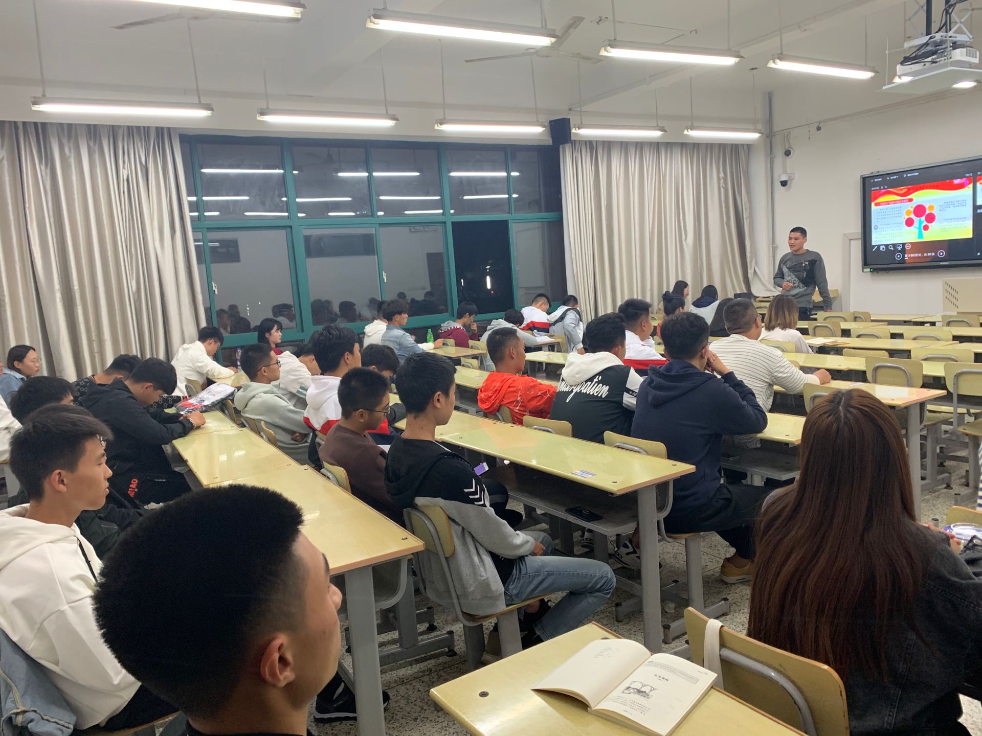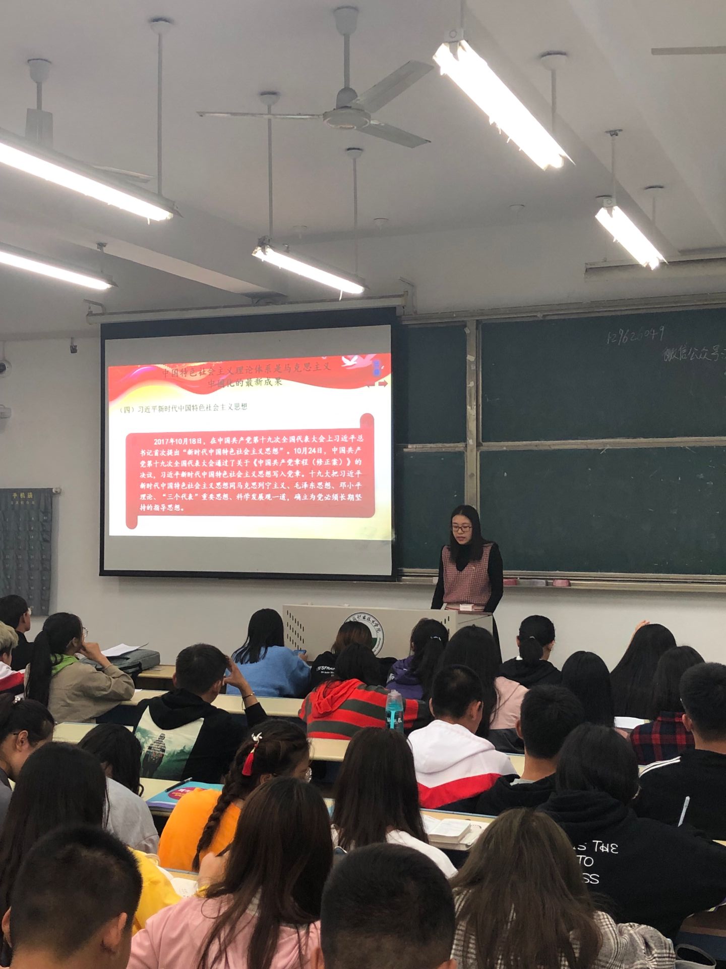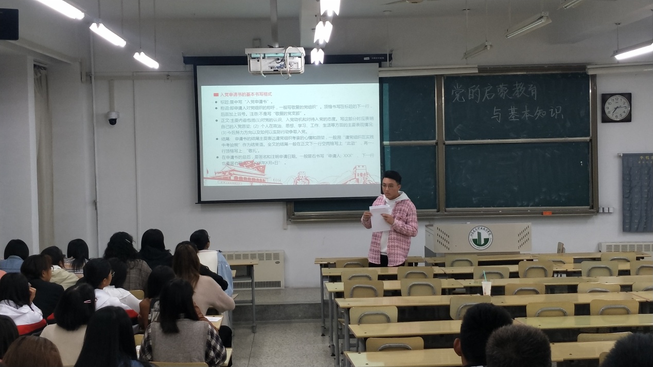 支部党员围绕“坚定理想信念、永远跟党走”主题,通过PPT、现场汇报、观看党课微视频等形式,讲述党的辉煌历程、领学《中国共产党章程》、解读《中国共产党发展党员工作细则》;认真指导同学们写入党申请书,耐心解答同学们的疑惑。
