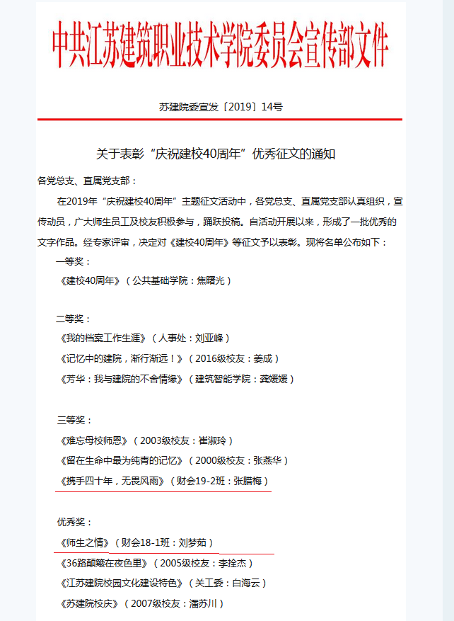 公司两名同学在“庆祝建校40周年”主题征文中获奖