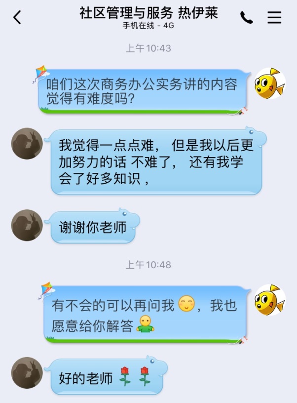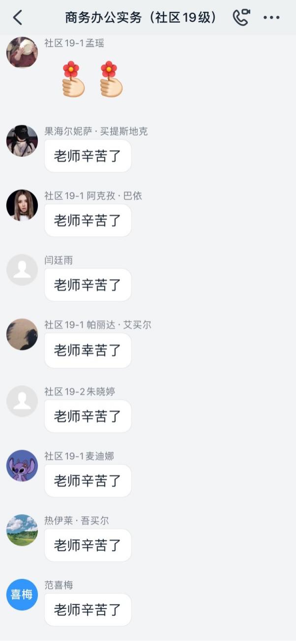 这学期我负责的课程是社区管理与服务专业的商务办公实务,专业内有近半数的员工是新疆籍少数民族员工,而且大多数是家庭经济困难的员工,因为他们在家期间没有电脑进行操作练习,我就不厌其烦一遍遍的讲,将操作步骤用选择题的方式跟他们互动,当下课结束后看到满屏的“老师辛苦了”的语句,感觉当老师的幸福感油然而生。让我感动的是新疆籍少数民族员工因为时差问题上课需要早起2个小时,但是他们却能够准时上课,所以我在课下更关注这些员工,会耐心的询问他们是否掌握了课程的内容,鼓励他们有不会的问题随时问我。