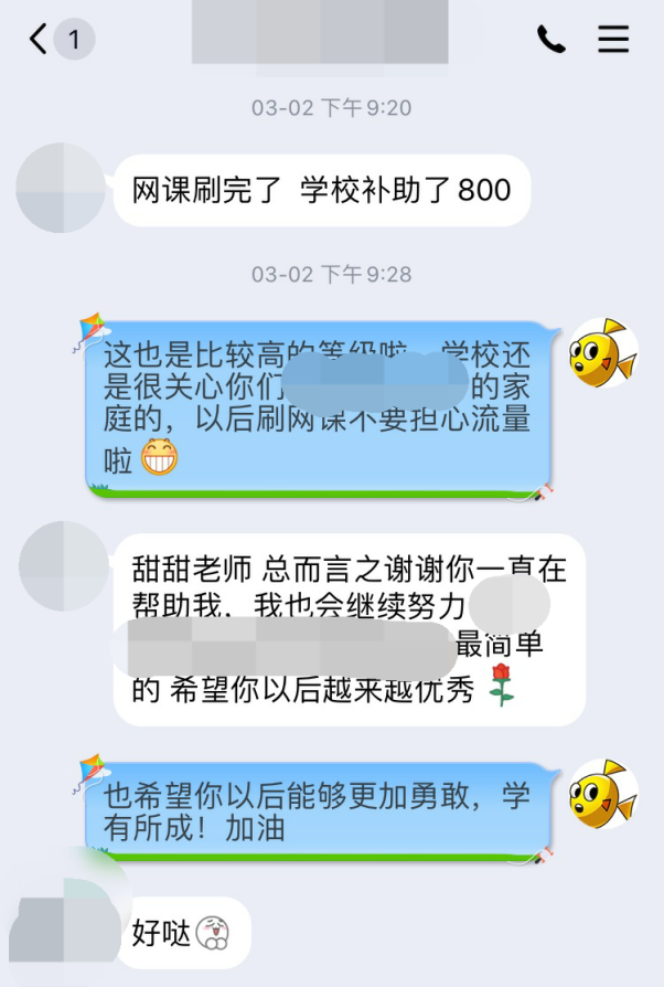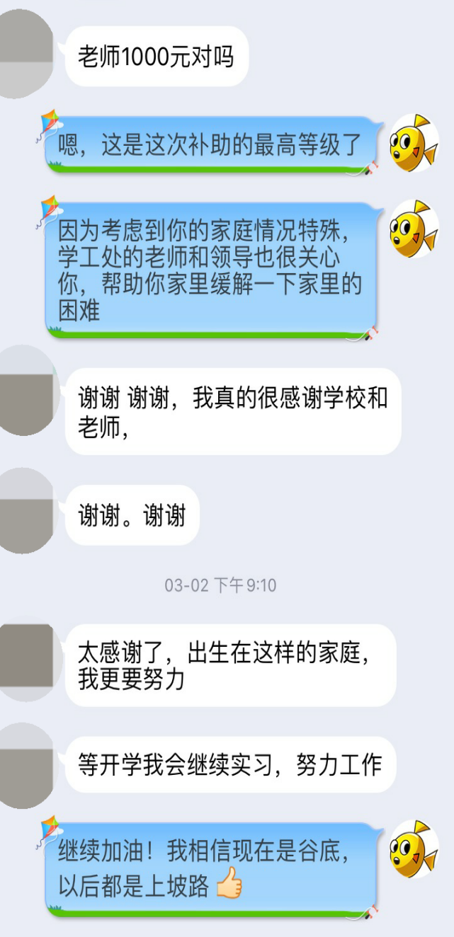 疫情期间还有一名家庭经济困难员工让我深深的牵挂着,临近寒假前她主动到办公室找到我,从她为难的神色、吞吞吐吐的只言片语,我慢慢读懂了她的内心,因为无法按时缴纳学费,家长不支持她再继续上学。于是我主动和她的家长打电话,刚开始也碰了壁,受了委屈,后来在我的反复劝说下家长的态度终于有所转变。疫情发生后我对她更多了几分挂念,当我了解到她因为家中没有无线网络,每天都在为网上上课流量不足发愁时,我立刻帮助她申请了临时困难补助,告诉她如何申请更多的流量,此外我还关注到员工家长性格强势,导致孩子性格比较胆怯和内向,我就在她遇到困扰时为她解决困难,在她无助时耐心的鼓励她继续好好学习,多次接触下我能感受到她的心在慢慢地向我敞开,“谢谢你一直在帮助我,我也会继续努力!” 这句简单的话语却温暖着我,让我感受到了一名辅导员的幸福所在。经济上的帮扶或许可以按照金额计算,但是一次次温暖话语的鼓励却不能以金钱衡量,从心出发,多一点关怀,才能让员工的心更暖一点,而这些受资助的员工也会将温暖传递给社会,为遏制疫情的扩散贡献力量。