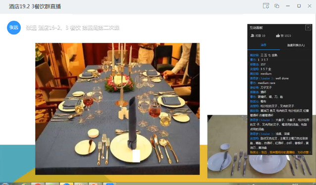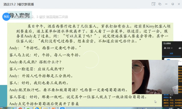 在刚开始线上教学时,因为担心网络卡顿导致直播不能正常进行,我是在软件选择上钉钉和腾讯课堂,两手准备。其次为了避免直播软件全部瘫痪,我前两周都及时提前录制了授课视频上传到泛雅平台上,并配合好练习,以备直播瘫痪时使用。对于餐饮课程而言,这学期有一部分内容是实操内容,需要在实训室进行,后面才有一部分理论内容,为了处理好特殊时期无法在实训室授课的问题,在请示之后,做了课程内容授课顺序上的调整,这里要特别感谢特殊时期公司领导、教务领导的支持和指导。