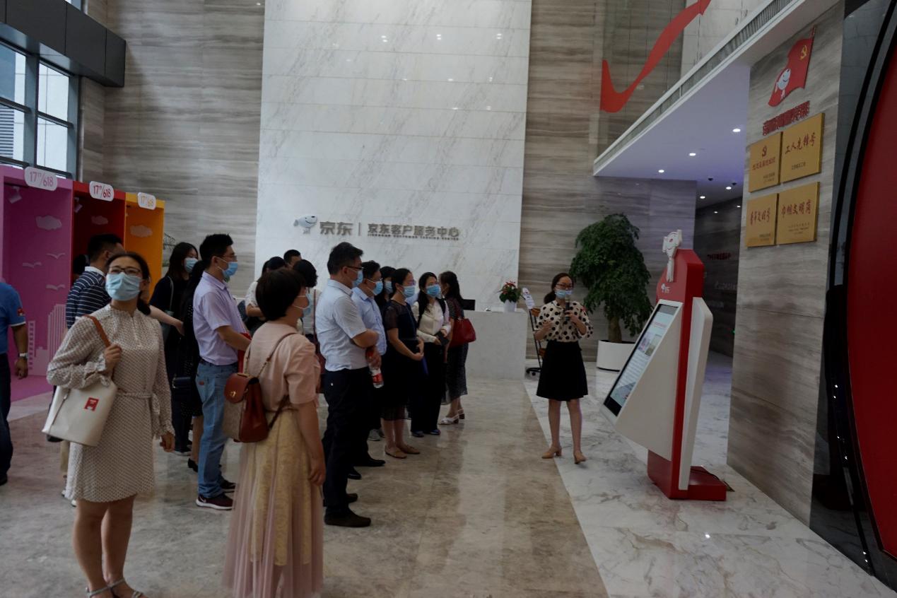 京东集团宿迁基地相关负责人对参观人员表示了热烈欢迎,并详细介绍了京东(宿迁)全国客服中心二期党建工作的具体内容以及取得的成果,随后全体专兼职辅导观摩了京东(宿迁)全国客服中心二期并体验了京东无人机配送、无人仓储管配、人工智能分拣等产业先进技术,切身体会了京东优秀的企业文化以及先进的科技水平。