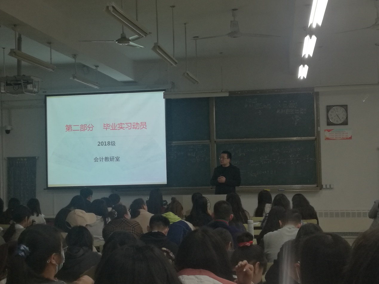 11月18日下午4:30, 财会专业在J3D-102举行毕业设计说明会暨顶岗实习动员会,财会专业全体教师和2018级全体员工参加了本次动员会。