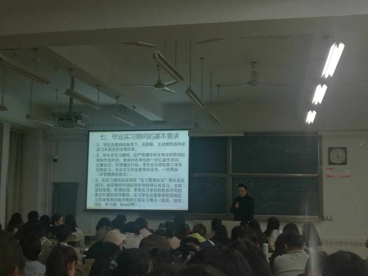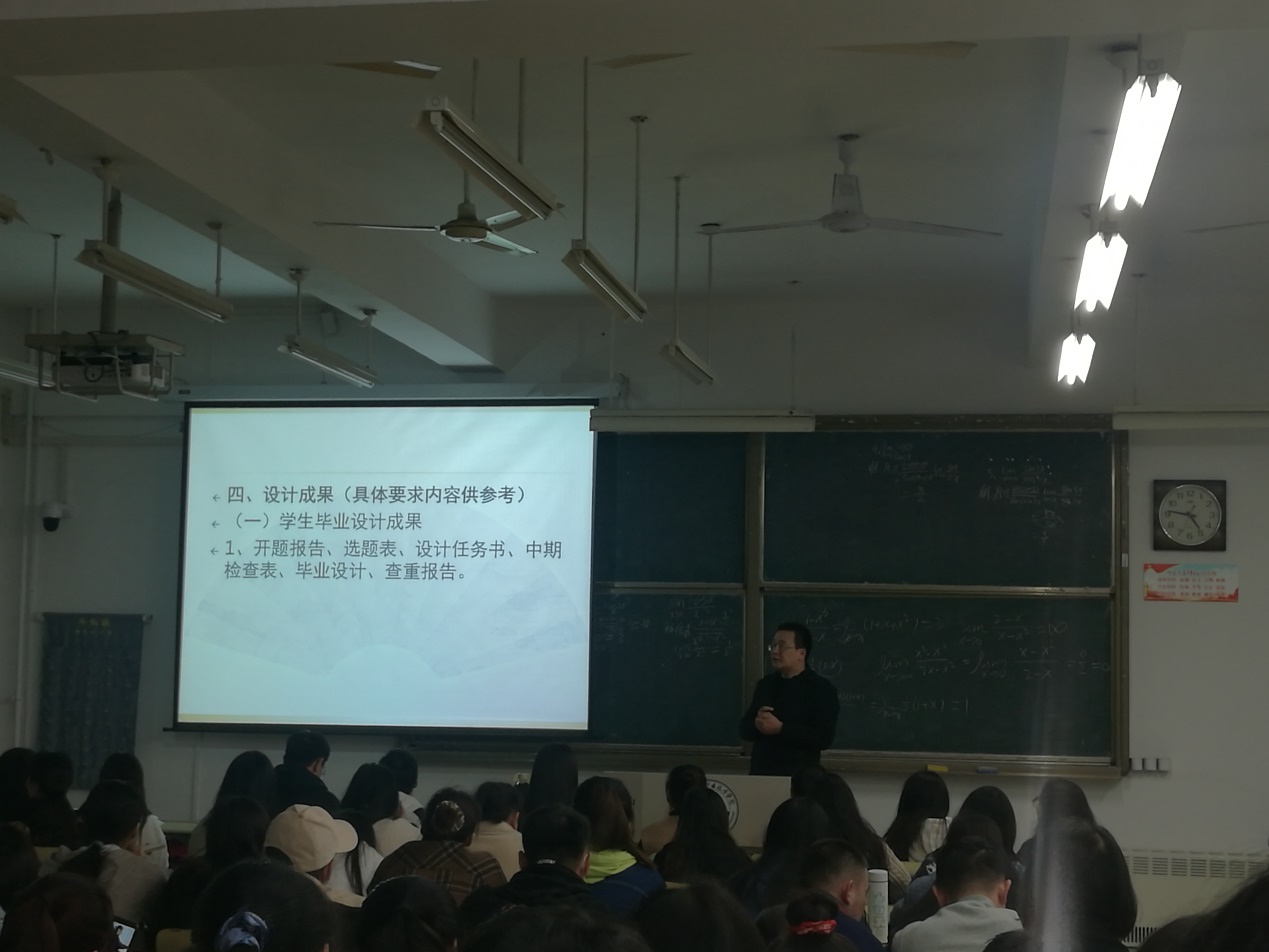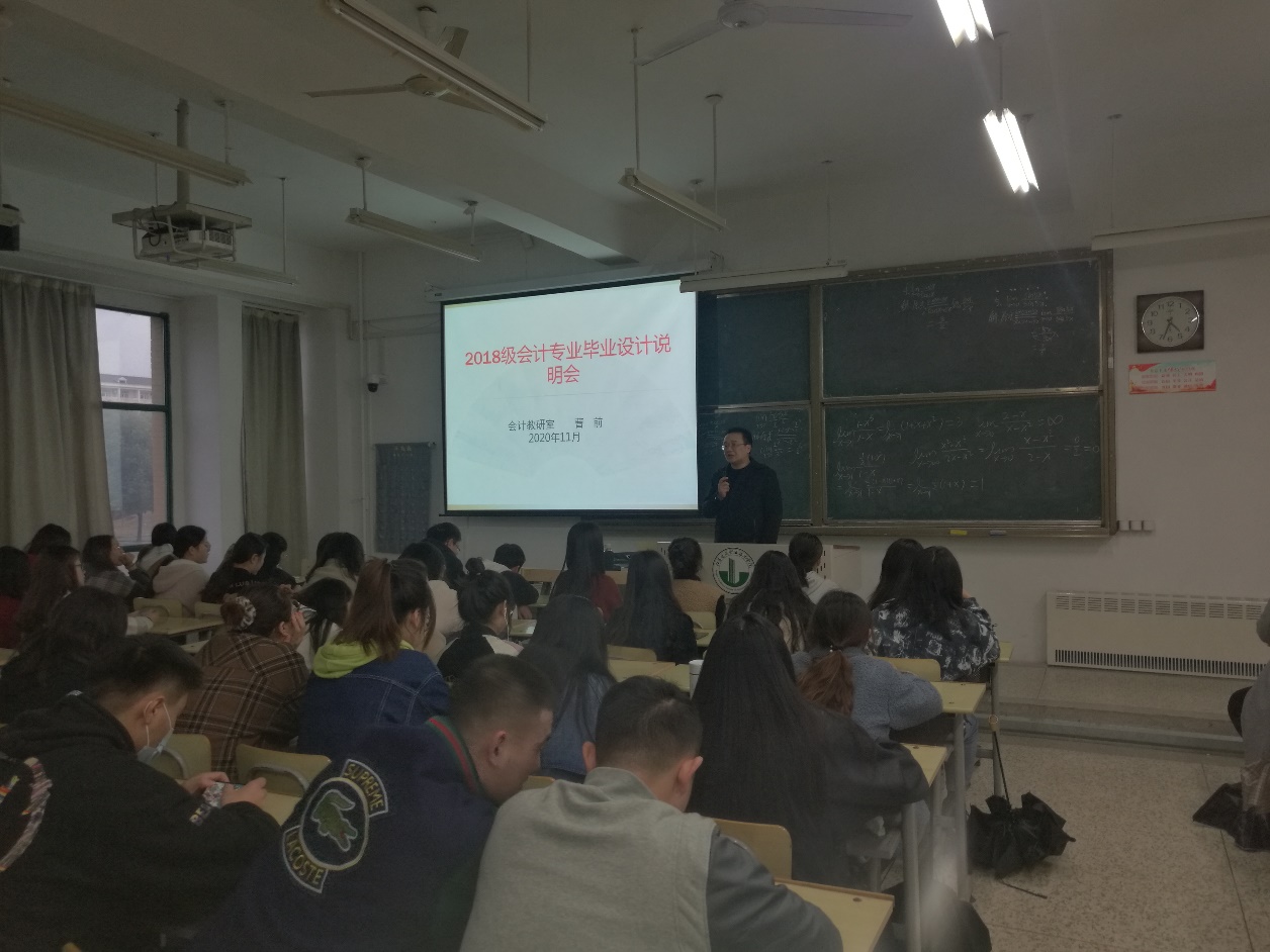 首先,教研室主任曹前老师讲解了会计专业毕业设计的相关要求。主要内容为毕业设计的目的、导师与员工的双选问题、论文的选题范围、时间进度安排及毕业设计考核及论文答辩等。曹主任强调员工在教师的指导下,应积极、主动地独立完成毕业设计所规定的全部任务。其中专接本员工以及准备专转本的员工也必须完成毕业设计,进行毕业实习。
