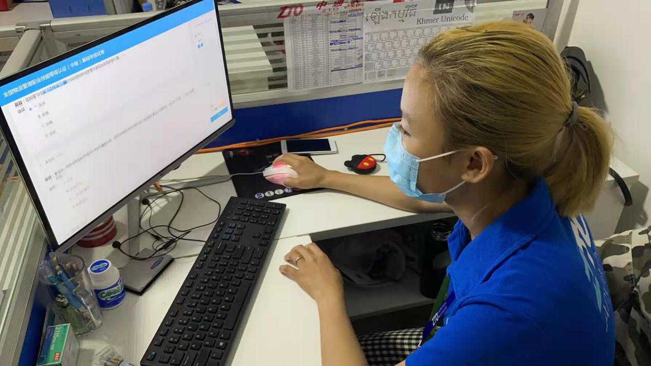 在参加考试的13名职工中,其中有1位特殊的职工谢丹(CHEA SOVANNTHYDA)。20岁的柬埔寨姑娘谢丹来自马德望省,目前是威廉希尔大三年级的一名职工。由于疫情影响无法到中国返校学习,2020年4月,谢丹通过应聘加入中通快递,负责翻译和网点开发工作。谢丹表示“我很荣幸能够参加中国物流管理