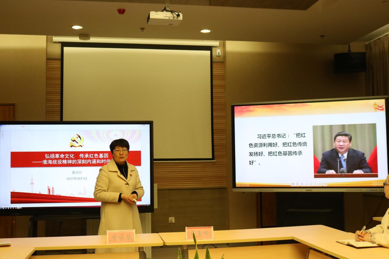 马克思主义公司蒋玉玲副教授做了题为《淮海战役精神的深刻内涵和时代价值》专题党课。蒋老师通过一张张图片、一件件实物、一个个场景,再现了会师淮海、决战中原的大战役,深入浅出地阐释淮海战役精神的深刻内涵和时代价值。