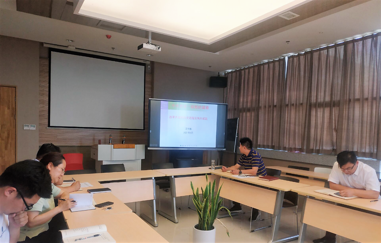 教师党支部书记王传彬做了主讲发言。首先,梳理了改革开放进程中最具影响力的大事,包括《光明日报》刊登题为《实践是检验真理的唯一标准》的特约评论员文章;党的十一届三中全会作出的实行改革开放的新决策,开始了中国从“以阶级斗争为纲”到以经济建设为中心、从僵化半僵化到全面改革、从封闭半封闭到对外开放的历史性转变;1979年国企改革开始、经济特区的诞生等。接着,支部书记王传彬结合自己的研究方向,从股权激励、股权改革方向探讨了国企改革以及农村改革。最后,王传彬结合公司工作,对公司、专业、课程的改革分享了感想。