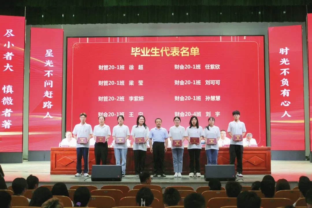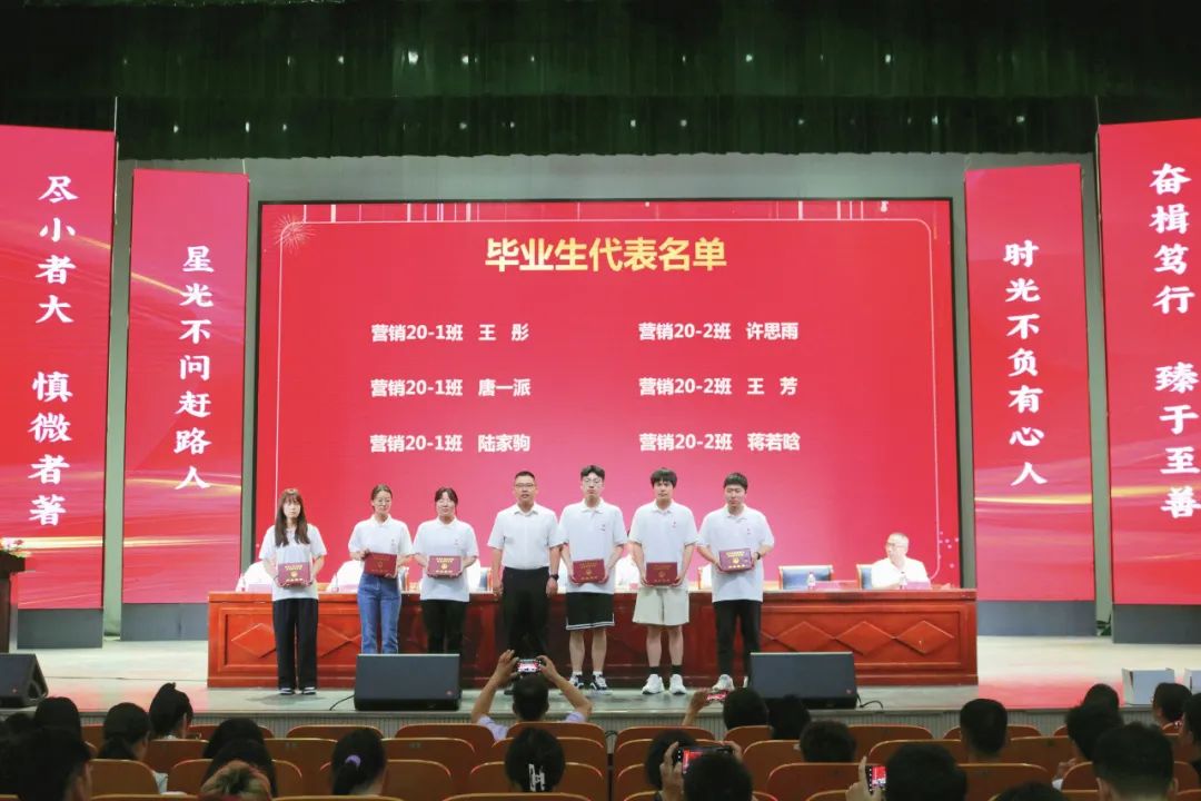 营销20-1班庄涛同学作为毕业生代表回忆了三年的成长与收获,表达了不舍与感恩,向母校和恩师致以最崇高的谢意,并向全体毕业生发起积极进取,圆满离校;遵规守纪,文明离校;昂扬斗志,自信离校的倡议。