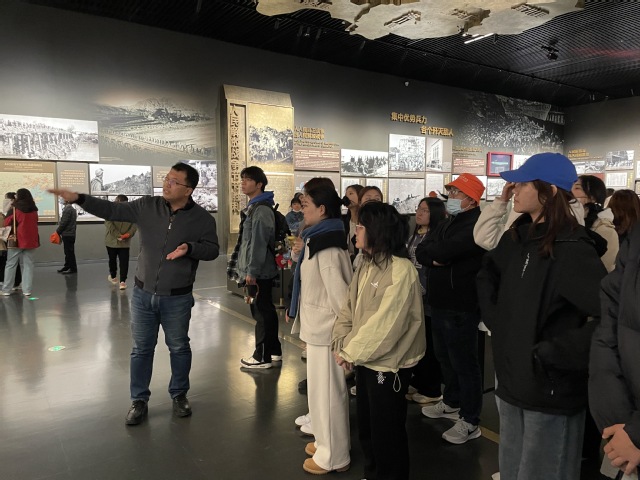 在庄严肃穆的纪念馆内,党总支副书记崔廷锋亲自担任讲解员,以专业而生动的讲述带领同学们重温那段峥嵘岁月。从战略决策到战役部署,从支前民工到浴血将士,他通过详实的史料和感人的细节,全景式展现了淮海战役“小车推出来的胜利”的历史画卷。同学们在珍贵文物、历史影像和实景复原前驻足凝望,无不为革命先烈“为有牺牲多壮志”的英雄气概所震撼。