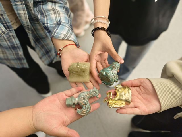 活动现场,同学们分为两部分,一组探寻三星堆的奥秘,另一组探寻帝王玉玺的奥秘。
