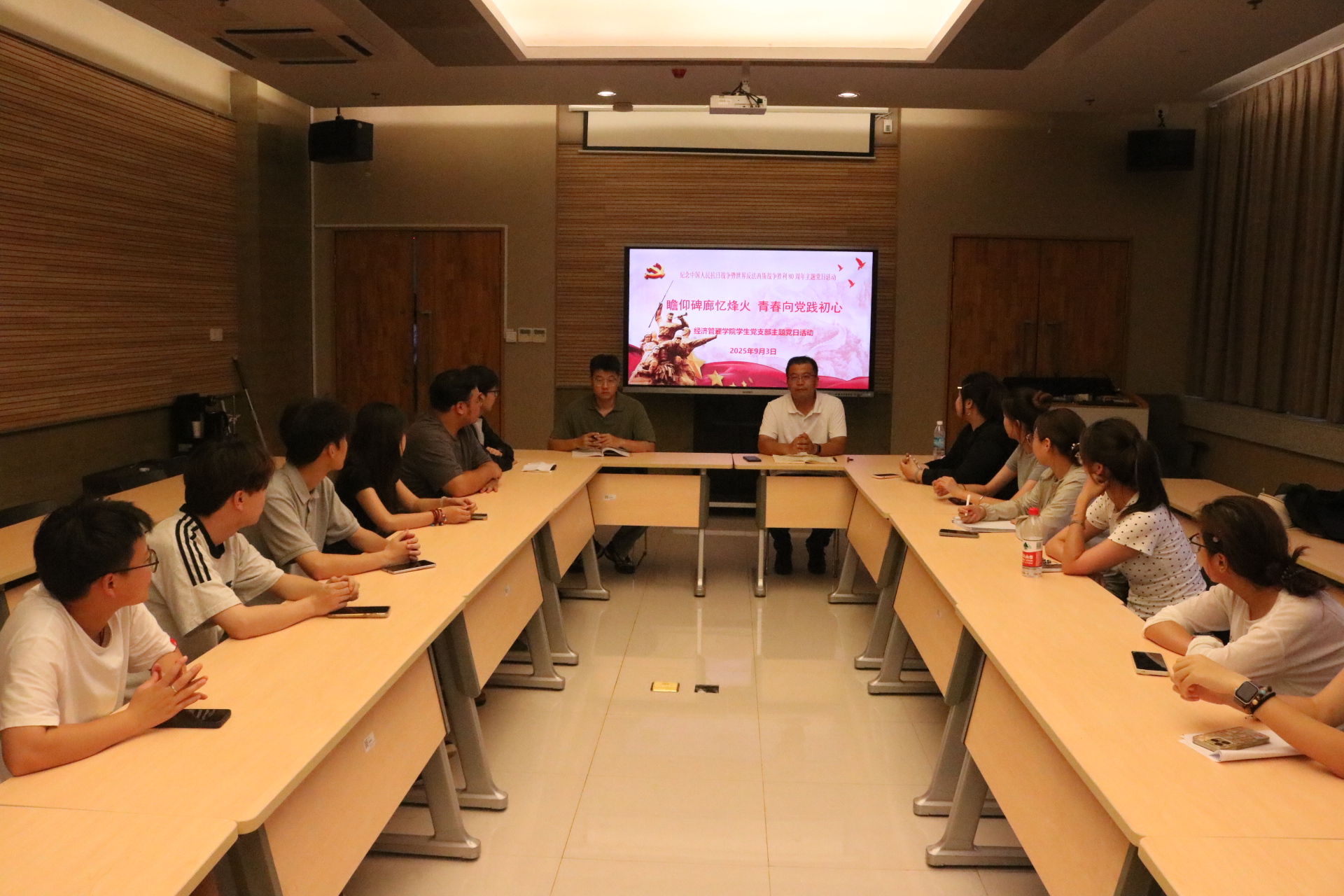 93日上午,员工党支部召开了专题学习感悟交流会。与会员工党员和入党积极分子结合前一天参观碑廊的切身感受,开展了深入的理论学习和思想交流。会上,“烽火印记 青春铸魂”社会实践团队员分享了暑期走访调研徐州地区抗日战争红色资源的经历和感悟。同学们踊跃发言,从不同角度畅谈对抗战精神的理解和新时代青年的责任担当,进一步增强了历史责任感和使命感,坚定了继承革命传统、赓续红色血脉的决心。