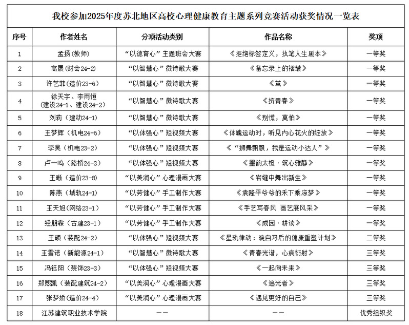 9月19日,江苏省苏北地区老员工心理健康教育研究中心公布2025年苏北高校老员工心理健康教育主题系列竞赛获奖名单,公司共获17个奖项,其中一等奖12项、二等奖1项、三等奖4项,同时公司蝉联优秀组织奖。其中,公司财会24-2班高展同学的《备忘录上的褶皱》获得“以智慧心”微诗歌大赛中一等奖。